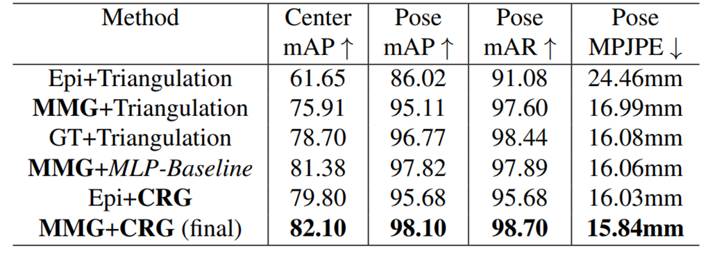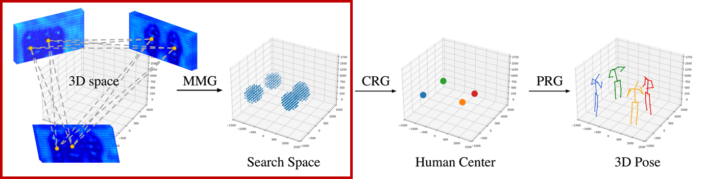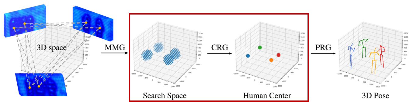이렇게 얻은 2D 위치로부터 3D human centers를 예측하기 위해, 본 연구는 MMG를 제안합니다. MMG를 통해 다른 카메라 시점으로부터 같은 사람의 중심을 매치시킵니다. 이후, triangulation을 통해 대략적인 3D human center 위치를 얻습니다. 여러개의 3D human center 후보들 중 CRG에 의해 선택됩니다.