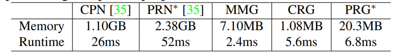 기존에 제시된 방법과 비교했을 때, MMG,CRG,PRG 모두 작아진 searching space덕분에 메모리 비용과 계산 시간이 감소했습니다.