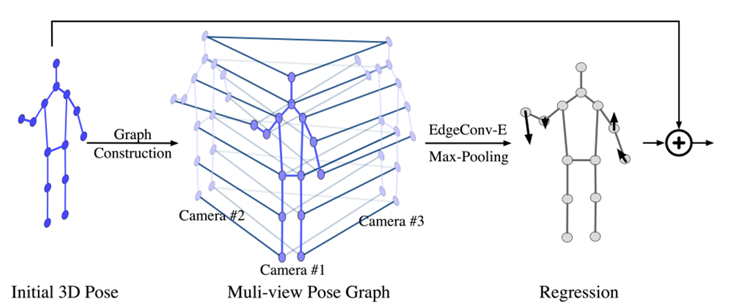 초기 3D poses를 만들기 위해 off-the-shelf pose estimator를 사용합니다. 본 연구는 상세한 수준의 single person pose estimation을 위해, Pose Regression Graph Module(PRG)를 제안합니다. 이 모듈은 몸 관절 사이 공간적 관계와 multiple views들 간 기하학적 관계를 이용하여 초기 3D poses를 정제합니다.