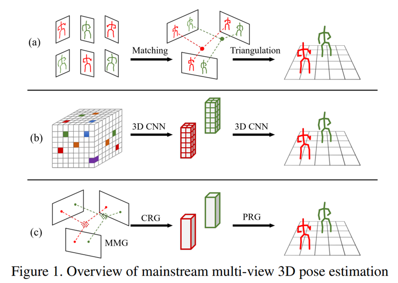 (a)와 같이, 2D-to-3D lifting 접근법은 먼저 각각의 시점에서 2D joints를 추정하고, 추정된 2D poses들을 같은 사람끼리 매치시킵니다. 이후, triangulation 이나 Pictorial Structure Models(PSM)을 통해 매치된 2D single-view poses를 3D로 변환합니다. 이 접근법은 일반적으로 실시간일때 효율적입니다. 그러나, 3D reconstruction 정확도는 폐색에 견고하지 않은 2D pose estimation에 의해 제한을 받습니다.