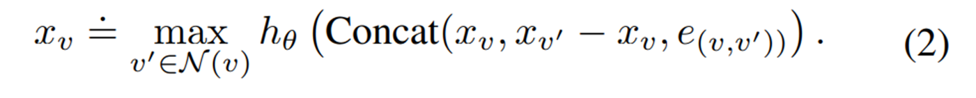 xv = 노드 피쳐 at v , xv' = 노드 피쳐 at v' , N(v) = v의 이웃 vertices, h = neural network (multi-layer perceptron)