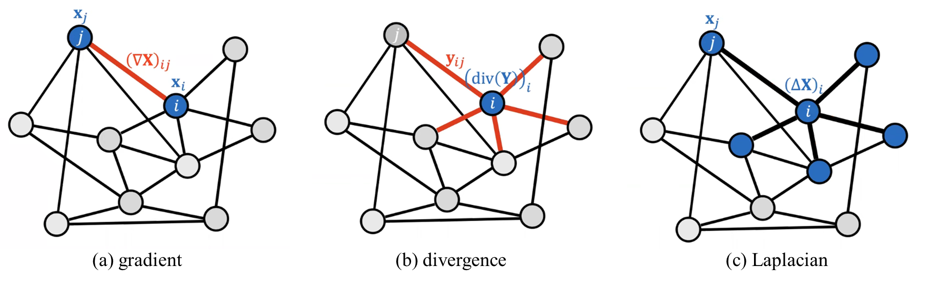 이 후 Motivation 각 미분연산자(e.g. gradient, divergence, Laplacian operator)가 그래프에서 어떻게 정의될 수 있는지와 더불어 GRAND는 Diffusivity를 어떻게 활용하는지를 살펴보겠습니다.