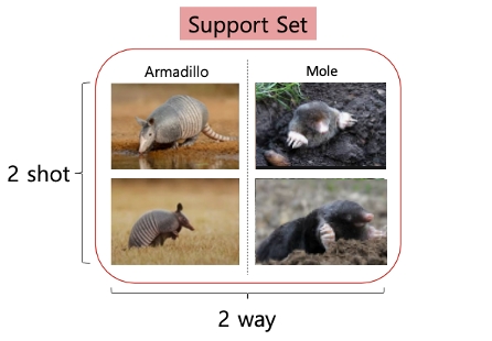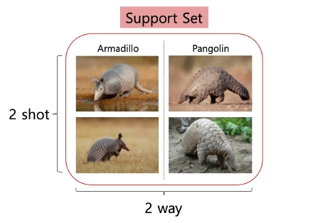 이라고 한다. 2개의 Class로 구성되어 있다면 2-way라고 하며, Class별로 2장의 대표사진을 보여준다면 2-shot이라고 한다. 그리고 1장의 새로운 사진을 보여주는 데 이렇게 맞춰보라고 보여주는 사진들을 Query Set