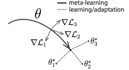 MAML은 최적화 학습 방식의 Meta Learning 방법론으로서 가장 대표적인 논문이라고 할 수 있다. 전체적인 개념은 어떤 Task에도 빠르게 적응(Fast Adaptation)할 수 있는 파라미터를 찾는 것이 이 모델의 목적이다. 일반적으로 딥러닝 모델은 기울기의 역전파를 통해 학습을 진행하나, 이런 학습 방법은 데이터가 충분히 많을 때 잘 작동하는 방식이다. 이 모델은 Task 하나하나에 대한 그래디언트를 업데이트 하는 inner loop와, 각 태스크에서 계산했던 그래디언트를 합산하여 모델을 업데이트하는 outer loop 단계로 이루어져있다(아래 그림에서의 실선). 공통 파라미터 는 Task agnostic하게 빠르게 적응할 수 있는 파라미터이고, 다시 모델이 이 파라미터로부터 어떤 Task를 학습하게 되면 그 Task에 최적화된 파라미터를 빠르게 찾을 수 있게 된다.