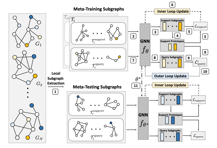 Local Subgraph를 사용한다는 이론적 정당성을 갖췄으므로, 이제 G-Meta의 Methodology에 대해서 상세히 살펴본다. G-Meta의 Architecture는 사실상 MAML[2]과 ProtoNet[1]을 Subgraph를 활용하여 합쳐놓은 것이라고 보면 간단하다.