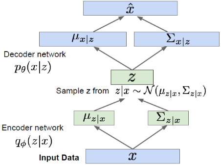 위 그림을 간단하게 설명하자면, 어떤 input data x 가 있을 때, Encoder network가 잠재변수 z 의 분포(평균과 분산)을 근사합니다. 만들어진 분포에서 z 를 sampling 하고 Decoder network는 x^ 을 만들어냅니다.