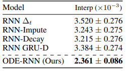 위 표에서 볼 수 있듯이, Interpolation에서는 Autoregressive 모델의 ODE-RNN이, Encoder-Decoder 모델의 Latent ODE(ODE-RNN encoder)가 성능이 가장 좋게 나왔습니다.